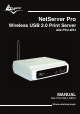 NetServer Pro 1.14 Technical Features Advanced Features Compact pocket size. Compliant with USB 2.0 high-speed printing. Fast 54Mbps WLAN connectivity based on IEEE 802.11g wireless high-speed standard. Multi protocol support is ideal for shared printing in mixed-LAN environments. Windows-based administrative program makes it possible to set up in a few steps. Latest MIB-II (RFC 1213) for SNMP standard management. Offer LPR program for TCP/IP printing in Windows 95/98/ME.