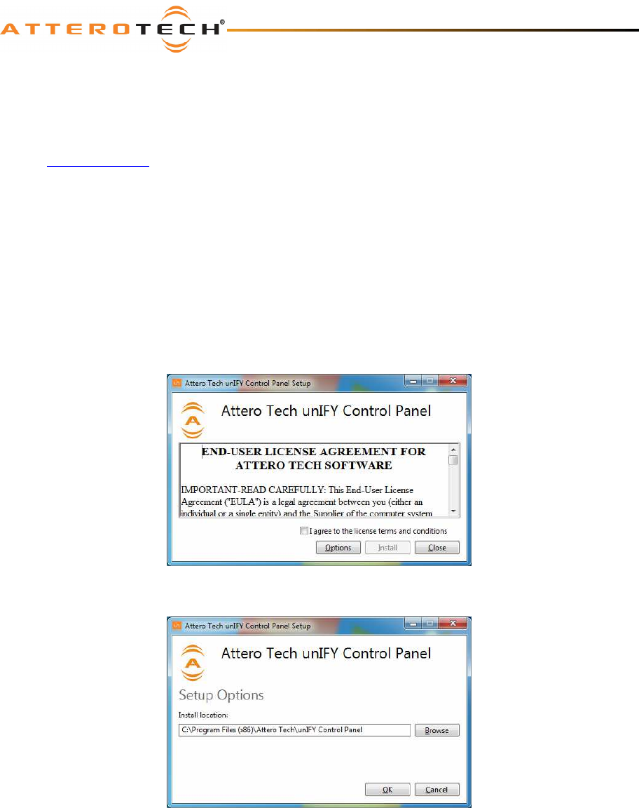 The software will install to a default location of c:\program Files (x86)\Attero Tech\unIFY Control Panel). Clicking the