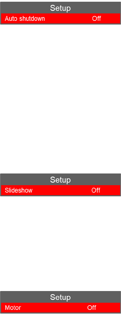 to select a Slideshow of all the still images stored on the Camera. Each image will stay