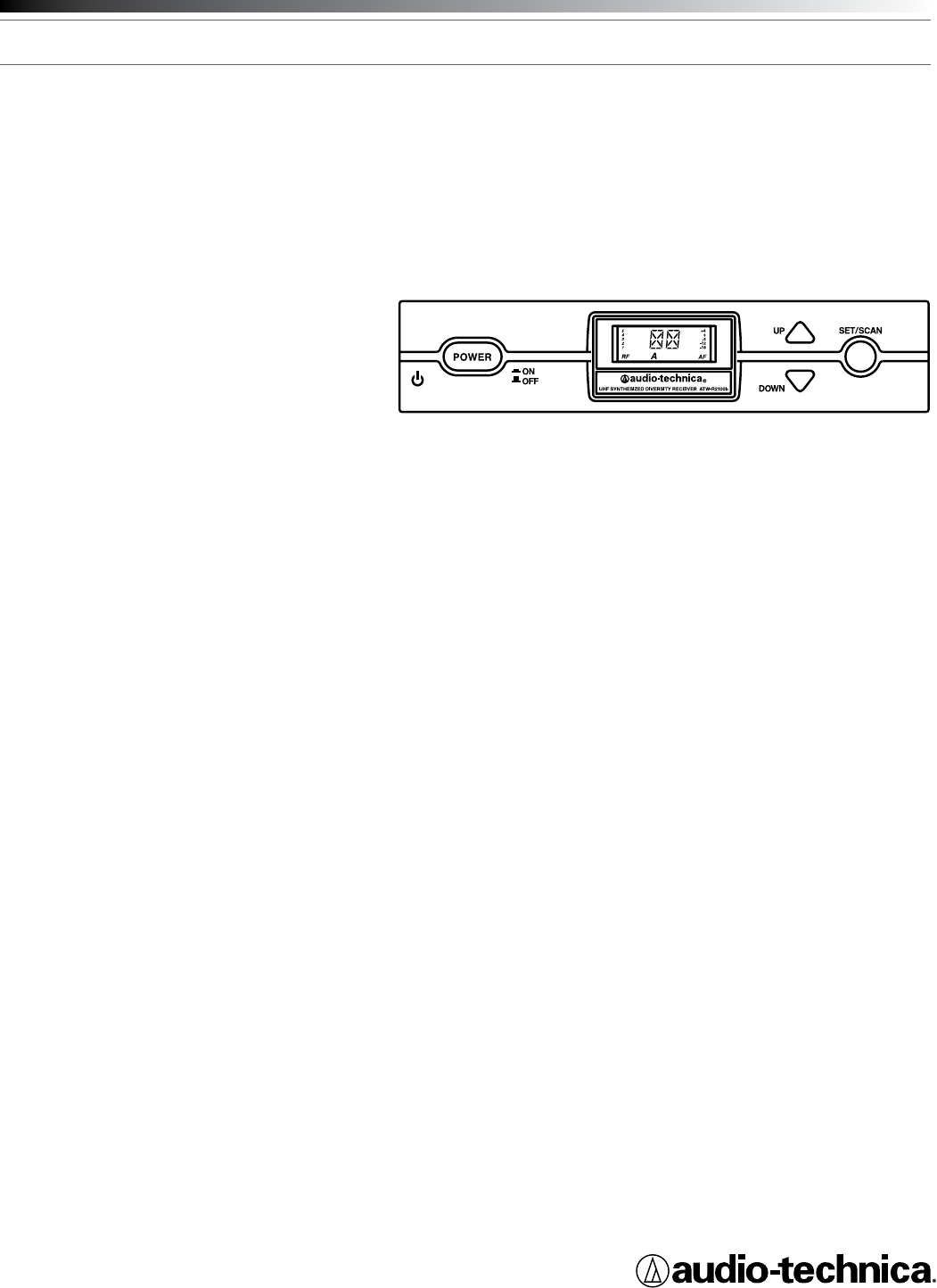 2000 Series Installation and Operation Switchable antenna power is also provided. Soft-touch controls provide convenient access to selection of operating frequency and automatic scanning, while an LCD information display provides constant monitoring of system operation. The receiver is half-width for a standard 1U 19" rack mount; rack-mount adapters are included. Two receivers can be mounted side by side, using an optional AT8630 joining-plate kit.