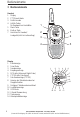 Operating Elements 3 Operating Elements Handset 1 Display 2 PTT button 3 Transmit ring tone 4 Up/Down Keys for changing channels and volume 5 Menu key 6 On/Off key 7 Connection socket for headset/ charger (not supplied) 1 7 2 3 6 Power PMR44 4 Display 1 Channel 2 Scan mode 3 Send 4 Receive 5 DCS activated (Advanced Digital Code) 6 CTCSS activated (sub channel) 7 Subchannel (CTCSS) 8 Displays 1/10 sec during stopwatch function 9 Call signal / vibrator function activated 10 Volume 11 VOX mode 12 Dual wa