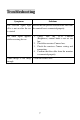 Troubleshooting Symptoms Solutions The ON/OFF signal light is not on after the car is started Ensure that the parallel red and black line from the control box is connected properly. No video signal appears while reversing the car 1. Verify that the LCD Contrast (Brightness) control knob is not set too low 2. Check the rearview Camera lens. 3. Check the rearview Camera wiring and connection. 4. Confirm that the cable from the monitor is connected properly.