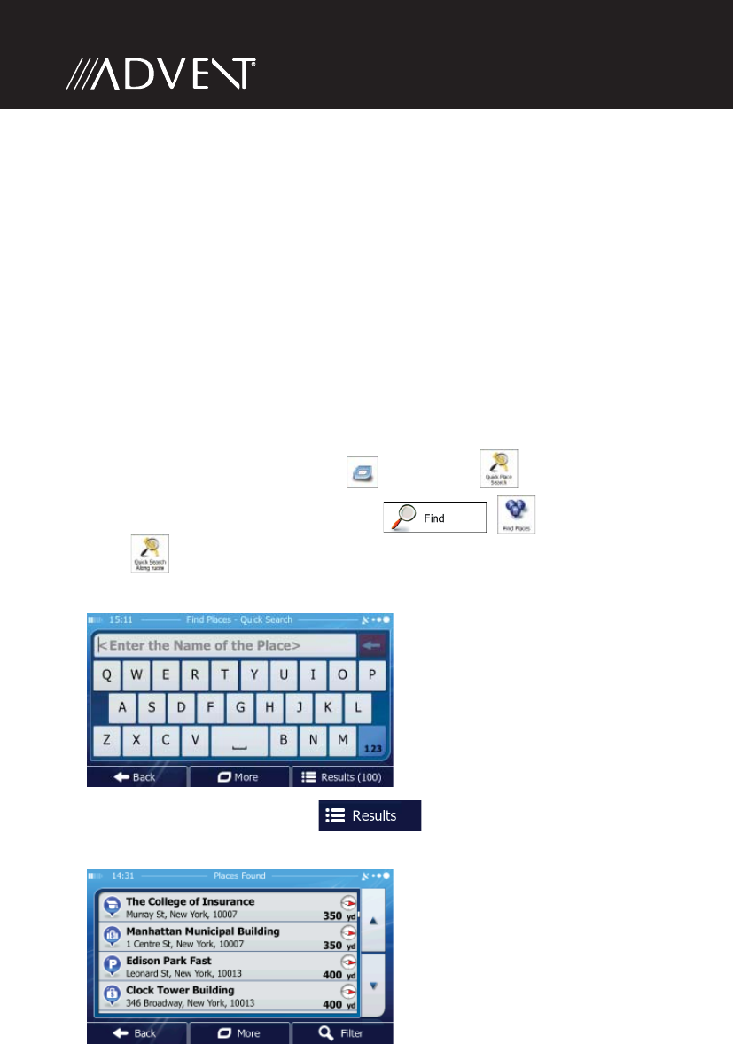 • with the Quick search feature, you can quickly nd a nearby Place by its name