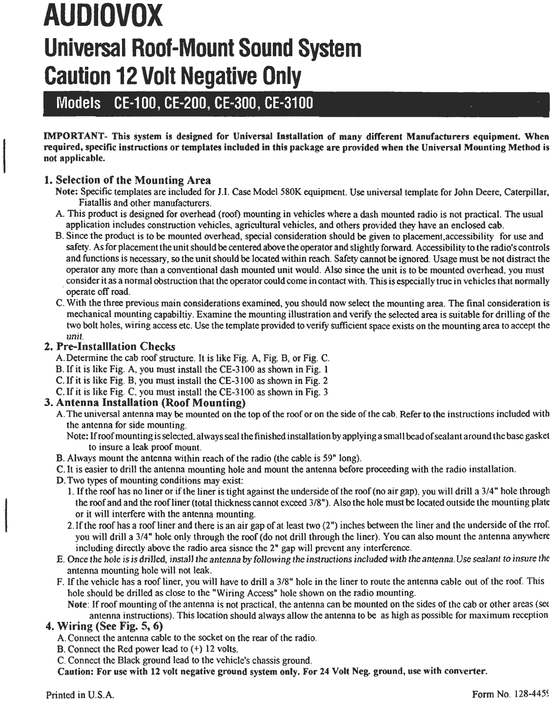 Caution: For use with 12 volt negative ground system only, For 24 Volt Neg. ground, use with converter.