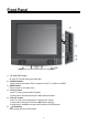 Front Panel 1. 15" color TFT screen 15" color TFT screen clearly show the data. 2. SOURCE button Press to select the modes: DVD, Component, VGA, TV, CVBS or S-VIDEO. 3. MENU button Press to enter or exit setup menu. 4. CH▲/▼ button In the TV mode, press to select channels. In setup menu, the same function as ▲/▼ direction buttons. 5. VOL▲/▼ button In the TV mode, press to decrease or increase the volume. In setup menu, the same function as ◄/►direction buttons.