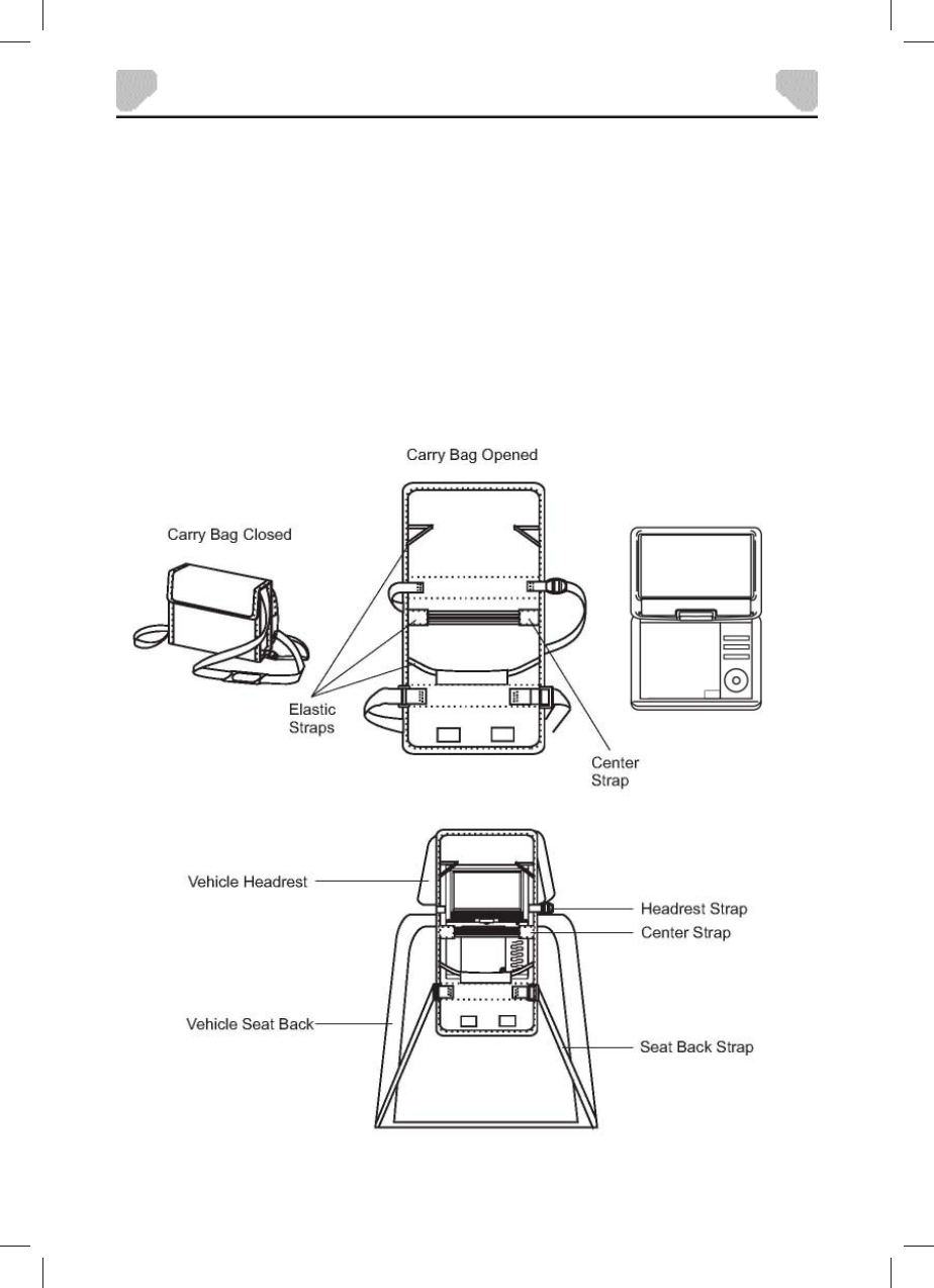 1. Unfold the carry bag, and place the DVD Player on the bag beneath the elastic straps. Ensure