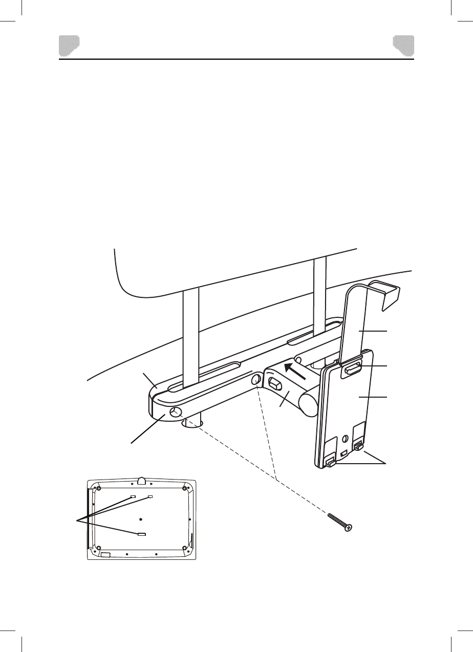 4. Install the player, at the attachment points, on to the hooks (E) on the mounting plate (F).