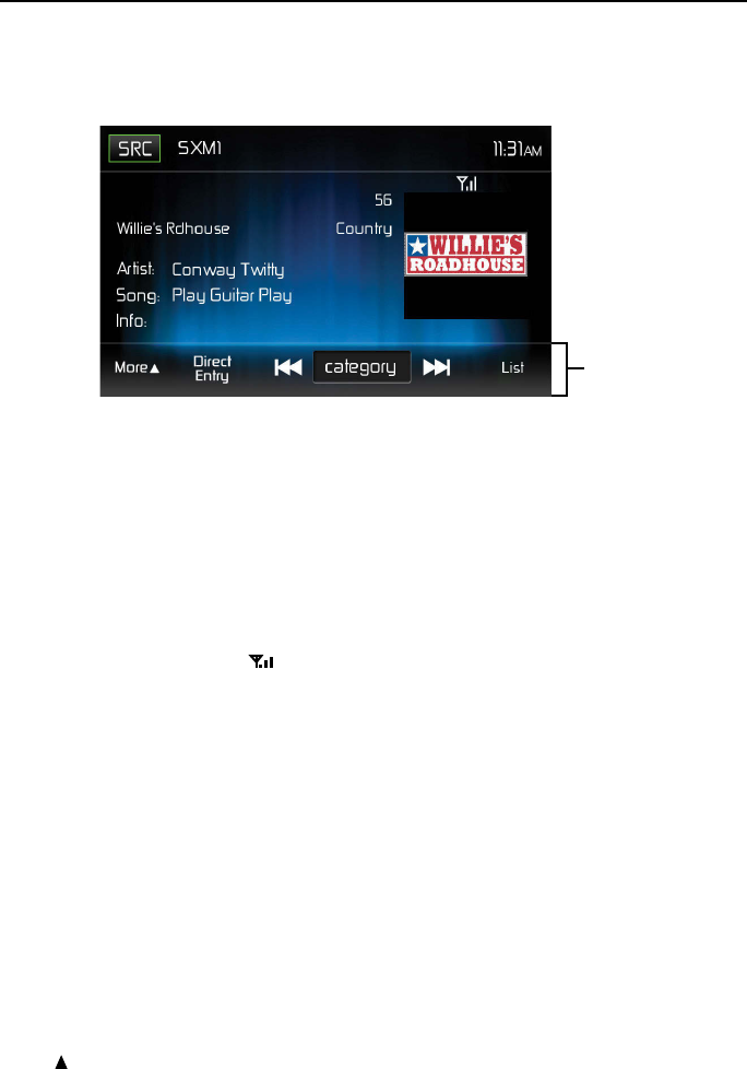 The on-screen indicators and touch key areas for SiriusXM® functions are outlined