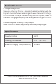Product Features • Charge management Sequence charging: Priority is given to charging the battery with the highest amount of power remaining, and when it reaches full charge, it will continue to charge the next battery with the highest power. In sequence charging mode, only one battery will be charged at a time. Please unplug once the battery is fully charged. Note: Inserting the battery may interrupt the battery being charged. Specification Operating Voltage ��.