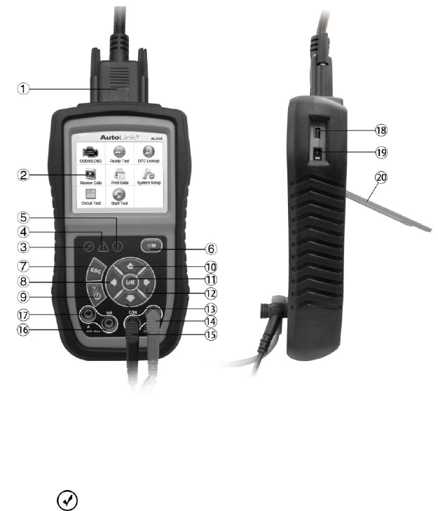1) OBD II CONNECTOR – Connects the scan tool to the