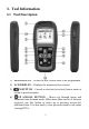 3. Tool Information 3.1 Tool Description 1) SENSOR SLOT – Holds the MX-Sensor need to be programmed. 2) LCD DISPLAY – Displays the menus and test screens. 3) N BUTTON – Cancels a selection (or action) from a menu or return to previous menu. 4) UP SCROLL BUTTON – Moves up through menu and submenu items in menu mode. When more than one set of data are retrieved, use this button to move up to previous screens for additional data. It is also used to view previous trouble code when viewing DTCs.