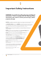 Important Safety Instructions The unit should be installed so that it is protected from the elements. It should not be exposed to water or rain. It is not to be immersed in water or sprayed directly by a hose or other device. The garage door must be well balanced. Sticking or binding doors must be repaired by a qualified garage door installer prior to installation of the opener. Frequently examine the installation, in particular cables, springs and mountings for signs of wear, damage or imbalance.
