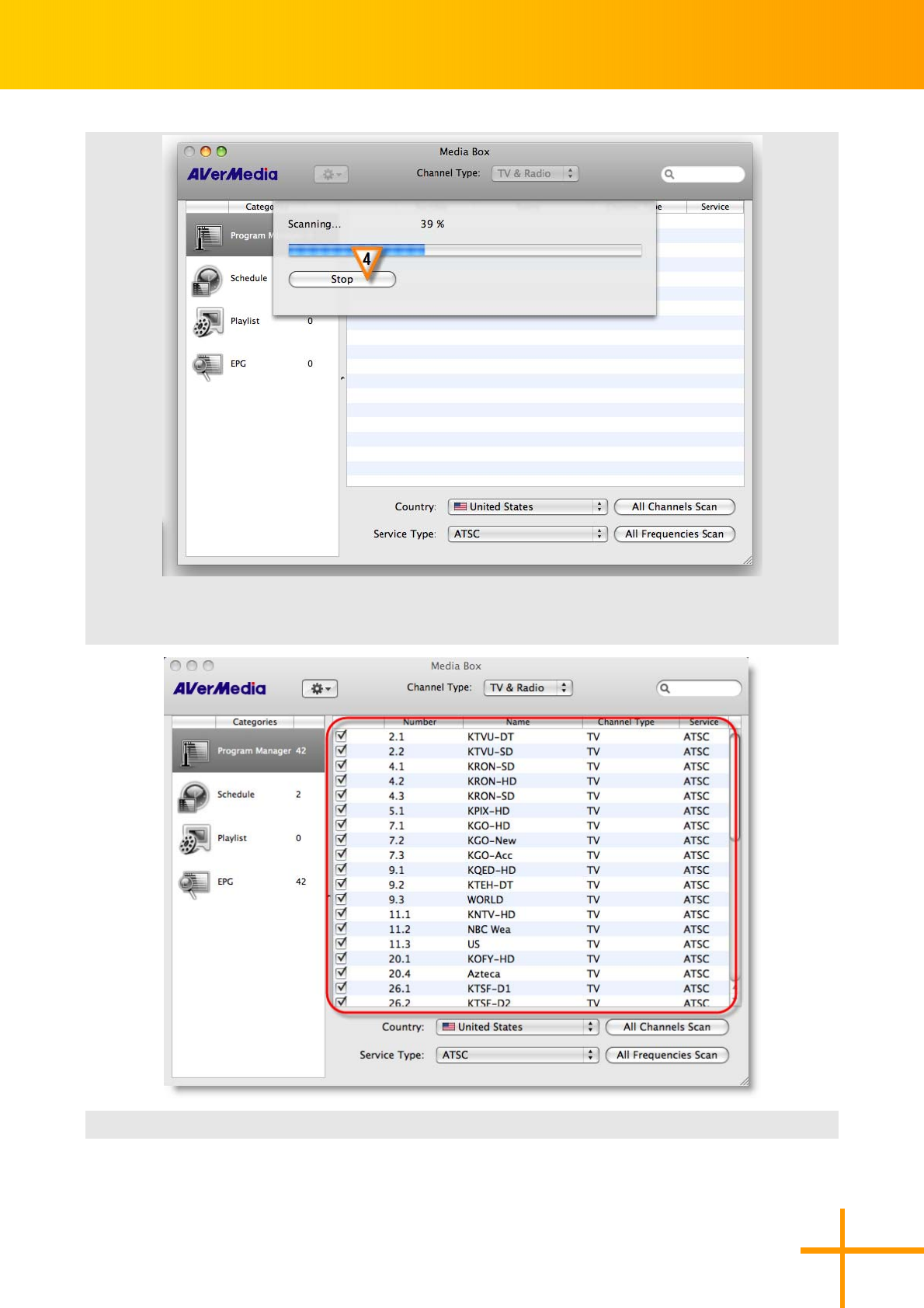 After scanning, new active channels/program