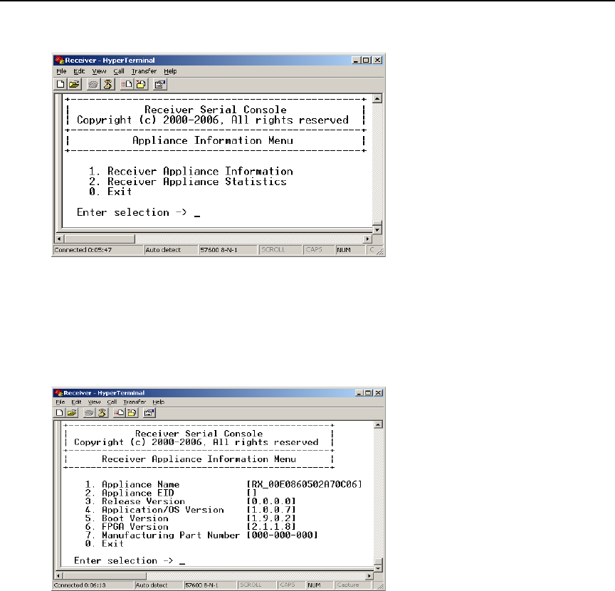 The Receiver Appliance Information Menu screen contains the following information: Receiver
