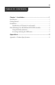 iii TABLE OF CONTE NTS Table of Contents Chapter 1: Installation...............................................................1 Introduction.............................................................................................1 Getting Started ........................................................................................1 Installation ..............................................................................................1 Introduction of I/O ports for each model...................