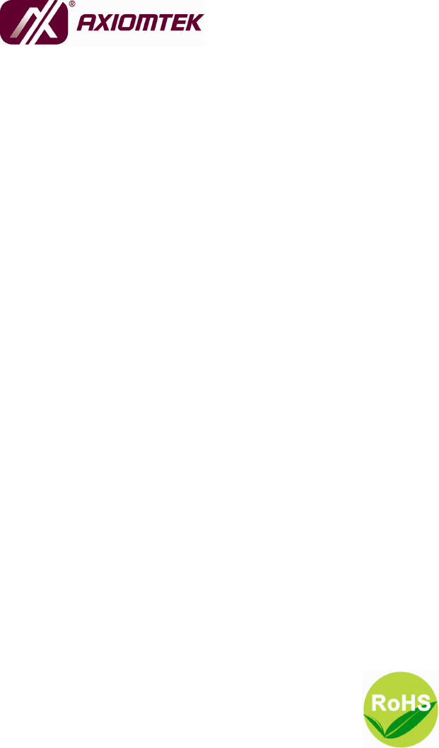 Disclaimers This manual has been carefully checked and believed to contain accurate information. AXIOMTEK Co., Ltd. assumes no responsibility for any infringements of patents or any third party’s rights, and any liability arising from such use. AXIOMTEK does not warrant or assume any legal liability or responsibility for the accuracy, completeness or usefulness of any information in this document. AXIOMTEK does not make any commitment to update the information in this manual.