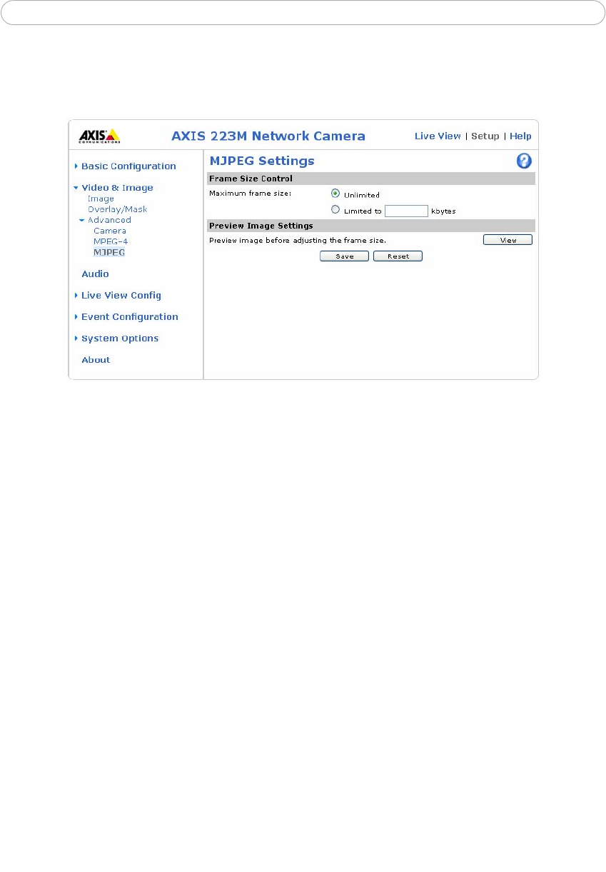 The MJPEG Settings window is used to control the frame size of the video stream in order