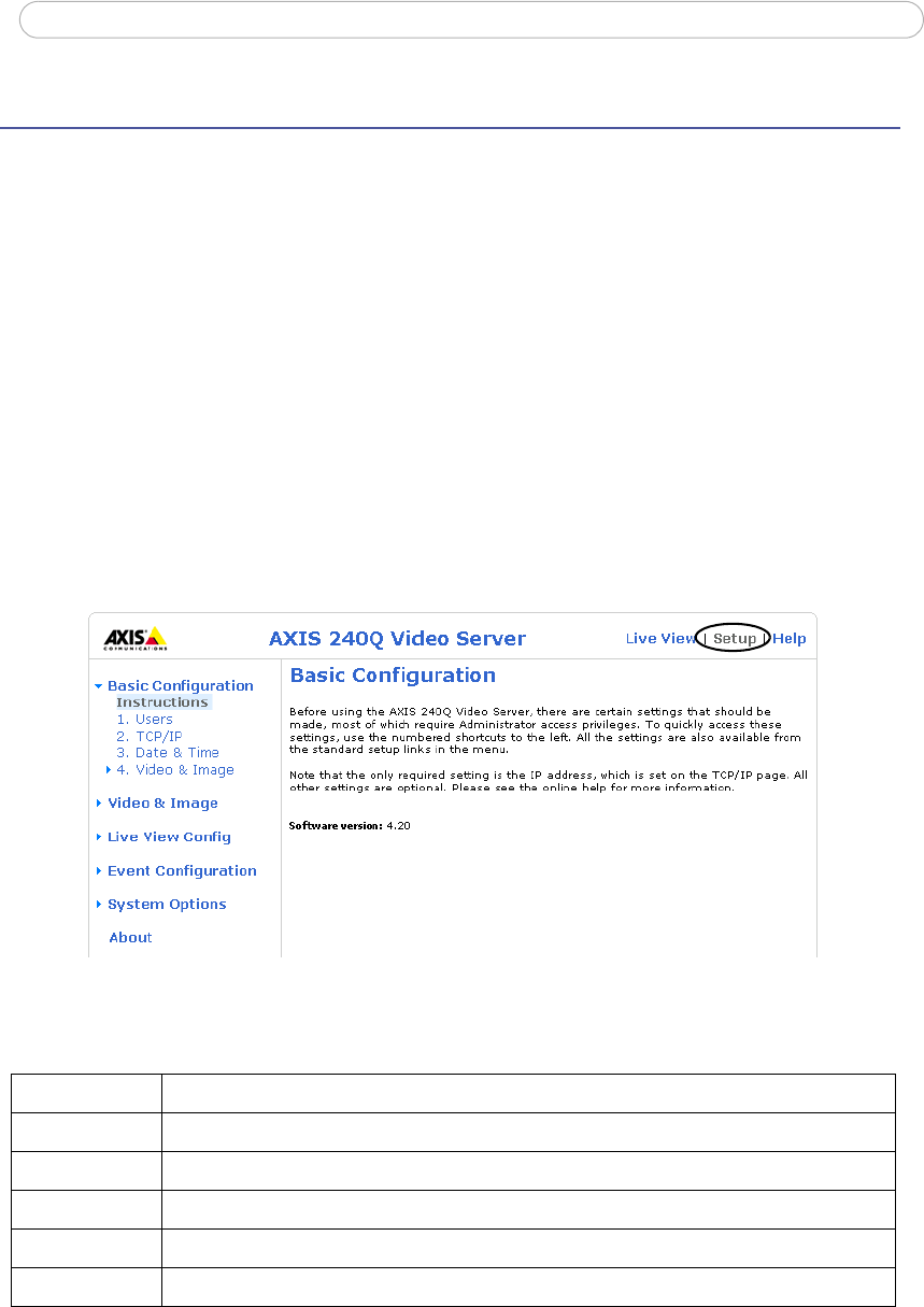 The AXIS 240Q is configured from the Setup link, in a standard browser (see Technical