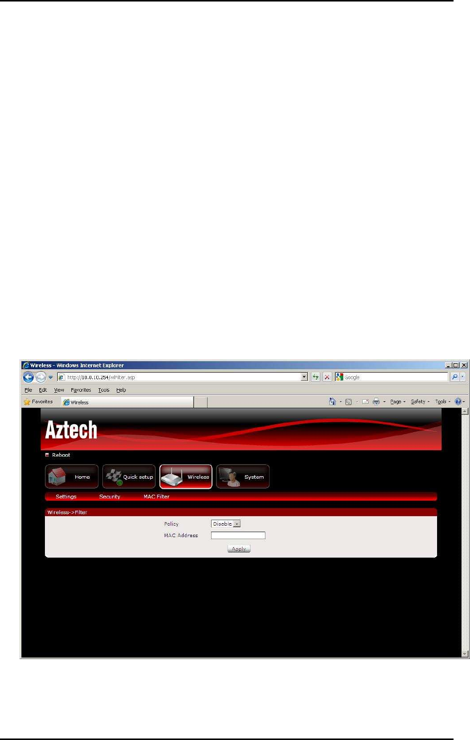 4. Click the Wireless button, and click MAC filter menu. You can select