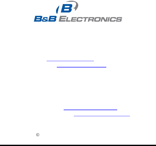 B&B Electronics RESERVED. No part of this publication may be reproduced or transmitted in any form or by any means, electronic or mechanical, including photography, recording, or any information storage and retrieval system without written consent. Information in this manual is subject to change without notice, and does not represent a commitment on the part of B&B Electronics.