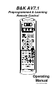 Introduction The B&K AV7.1 remote control is preprogrammed to operate over 1,000 Audio and Video components so that you can set it up by simply punching in a threedigit code number that matches your equipment. The AV7.1 also has the ability to learn new functions from your original remote controls, allowing you to customize the remote to your own needs and update it as you add new equipment. Please refer to pages 8 – 16 for instructions on setting up the remote control. AV7.