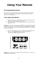 Using Your Remote D. Operation After you have programmed the remote control for your equipment, use the following procedures to operate your home entertainment system: 1. 2. 3. Press the Device Button that you wish to operate: i.e. to operate a TV, press the TV device button: to operate a VCR, press the V1 Device Button, etc. Aim the remote control at the device and press the POWER button to turn the device on. Press the buttons that send out the commands you desire.