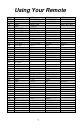 Using Your Remote No. 1-8 9 10 11 12 13 14 15 16 17 18 19 20 21 22 23 24 25-29 30 31 32 33 34 35 36 37 38 39 40 41 42 43 44 45 46 47 48 49 50 51 52 53 54 55 Button Name Device Name Power / On Mute Off VOLUME + VOLUME – CHANNEL + CHANNEL – Up / Pause Down / Stop Right / F.F. Left / Rew. Sel / Play Save / I<< / Mode Menu / >>I Exit / Rec.