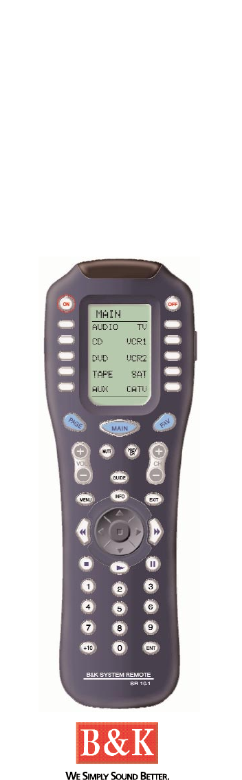 Thank you for purchasing the B & K SR 10.1 System Remote Control! Table of Contents Finding the MAIN Menu 1 Please use this manual as a guide to operating your home theater after the remote control is programmed by your dealer for automated operation. The SR10.1 remote control is preprogrammed at the factory to operate the B & K component only. See your dealer for information on programming the SR10.1 remote control. GUIDE TO SIMPLE HOME THEATER OPERATION © 2002 B & K Components Ltd. All rights reserved.