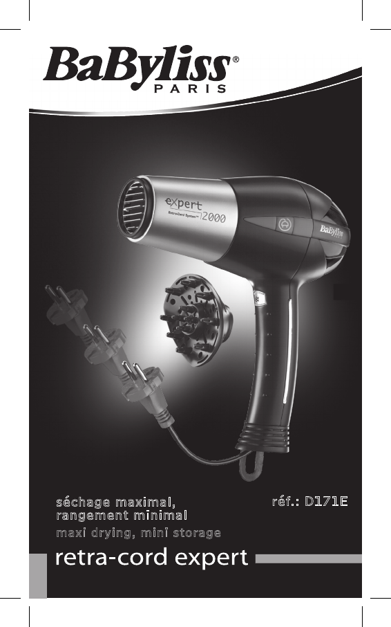приспосабливается к особенностям контура головы и облегчает укладку волос и придание объема прическе РУССКИЙ retra-cord expert 2000W Аппарат retra-cord expert 2000W, последняя новинка линии Expert фирмы BaByliss, разработанная с применением новейшей технологии, - один из сильнейших профессиональных фенов, обладающих следующими техническими характеристиками: • Retra-Cord SYSTEMTM: простого нажатия кнопки достаточно, чтобы шнур полностью скрутился внутри ручки аппарата.