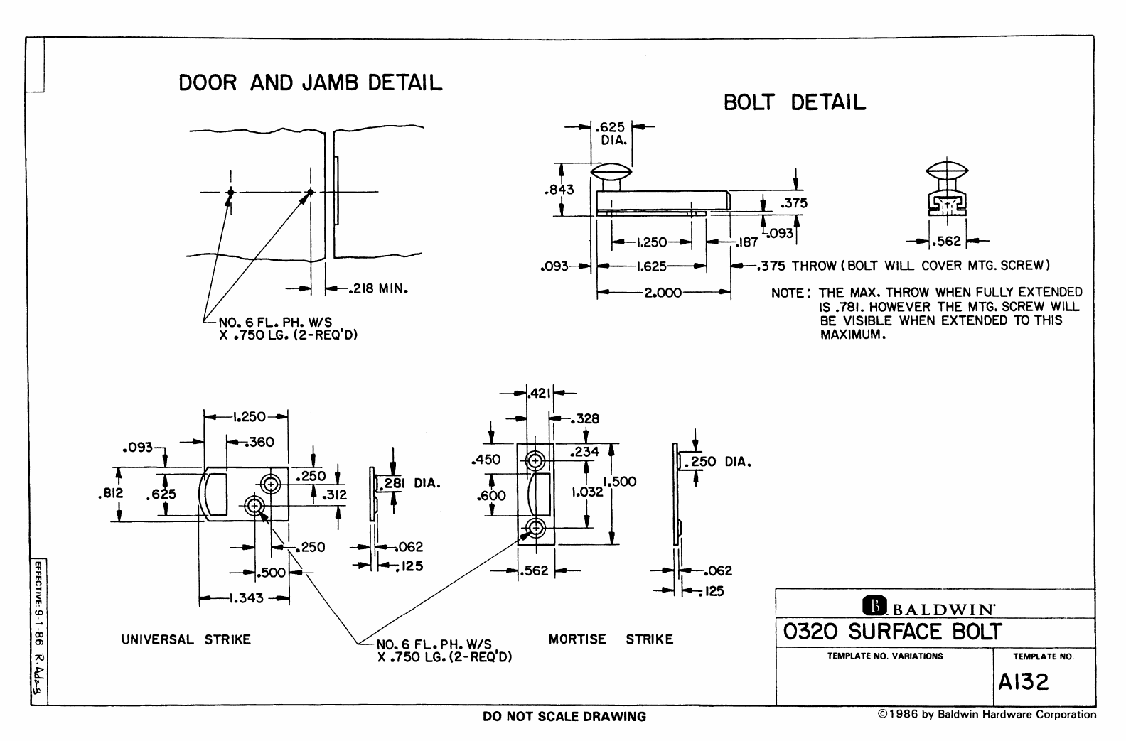 J DOOR AND JAMB DETAIL BOLT DETAIL e —wd 625 DIA. r L 843 ars % E-" i—»— 093w e 508 he375 THROW (BOLT WILL COVER MTG. SCREW) <218 MM, P 3,000 e NOTE: THE MAX. THROW WHEN FULLY EXTENDED 1S .781. HOWEVER THE MTG. SCREW WILL NOL BFL, PH, WS BE VISIBLE WHEN EXTENDED 70 THIS X 780 e, (2-REC'D MAXIMUM. 1.250 ] ; L0985 T o360 zgo 450 ié T L2580 DIA, ‘;g; 250 62 } 500 125 562 fl! 062 be1.343 o <128 ce Windsor UNIVERSAL STRIKE NO. 6 FL.PH. WIS MORTISE STRIKE 0320 SURFACE BOLT X HEALTH L6 (2-RED) TEMPLATE NO.