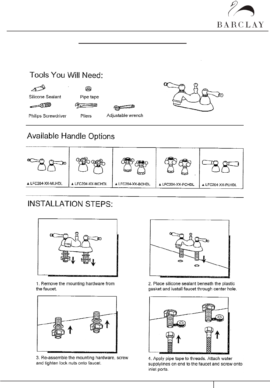 Centerset Lavatory Faucet LFC204 INSTALLATION INSTRUCTIONS 4/16/18 P 847•244•1234 www.barclayproducts.