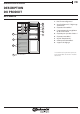 FR Guide d'utilisation et entretien DESCRIPTION DU PRODUIT APPAREIL 5 6 7 8 1 2 3 1. Bac à fruits et légumes * 2. Zone fraîcheur 0°C / Dégivrage sécuritaire* 3. Clayettes à bouteilles * 4. Compartiment de congélation et de conservation 5. Clayette pour produits laitiers * 6. Clayettes amovibles * 7. Voyant Température * 8. Galerie porte-bouteilles* 9. Support de réglage 4 9 * Le nombre ou les positions peuvent varier, disponible sur certains modèles seulement.