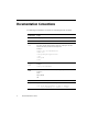 Documentation Conventions The following documentation conventions are used throughout this document. Convention Usage Ctrl+Tab Keys you press simultaneously. italics Emphasis and book titles. monospace text Code samples, commands and their options, Java classes, data types, directories, and file names and their extensions. Monospace text also indicates text that you enter from the keyboard. Examples: import java.util.Enumeration; chmod u+w * config/examples/applications .java config.
