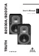 TRUTH B2030A/B2031A TRUTH High-Resolution, Active 2-Way Reference Studio Monitor B2030A/B2031A s Ultra-linear frequency response from 50 Hz to 21 kHz with individual frequency diagrams s Built-in 75- and 35-Watt (B2031A: 150- and 75-Watt) power amps with enormous power reserve s Ultra high-resolution ferrofluid-cooled tweeter s Long-throw 6 ¾" woofer (B2031A: 8 ¾") with special polypropylene diaphragm and deformation-resistant aluminum die-cast chassis s Controlled dispersion characteristics and ext