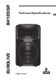 EUROLIVE B412DSP EUROLIVE Digital Processor-Controlled 600-Watt 12" PA Speaker System with Integrated Mixer B412DSP s High-power 600-Watt 2-way PA sound reinforcement speaker system with integrated mixer for live and playback applications s State-of-the-art 24-bit digital signal processor for ultimate system control - Digital crossover, phase and time correction for perfect driver alignment plus dual compressor/limiter for total system protection - Digital noise gate, low-cut filter, 2-band EQ, dynamic