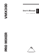 PRO MIXER VMX300 TABLE OF CONTENTS 1. INTRODUCTION..................................................................................................................... 5 1.1 Before you get started ..................................................................................................................... 5 2. FRONT PANEL ........................................................................................................................ 6 2.1 2.2 2.3 2.4 2.5 2.6 Input channels ...............