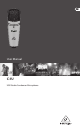 C-1U User Manual 5. Specifications Transducer type condenser, 16 mm (0.63'') Polar pattern cardioid Frequency response 40 Hz to 20 kHz Max. SPL (1% THD @ 1 kHz) 136 dB Connector USB connector type B Power supply 5 V, max. 50 mA (via USB) Physical/Weight Dimensions 0 shaft: 2.1", length: 6.7" 0 shaft: 54 mm, length: 169 mm Weight (net) approx. 1.17 lbs / 0.53 kg BEHRINGER is constantly striving to maintain the highest professional standards.