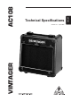 VINTAGER AC108 SPECIFICATIONS AUDIO INPUTS Guitar input 1/4" TS connector CD input 1/4" TRS connector AUDIO OUTPUTS Headphone output 1/4" TRS connector SYSTEM DATA Output stage power 15 Watts RMS into 4 Ohms LOUDSPEAKER Type Impedance Power rating POWER SUPPLY Mains voltage DIMENSIONS/WEIGHT Dimmensions (H x W x D) Weight 8" vintage design guitar loudspeaker 4 Ohms 20 Watts USA/Canada U.K./Australia Europe Japan 120 V~, 60 Hz 230 V~, 50 Hz 230 V~, 50 Hz 100 V~, 50 - 60 Hz approx.