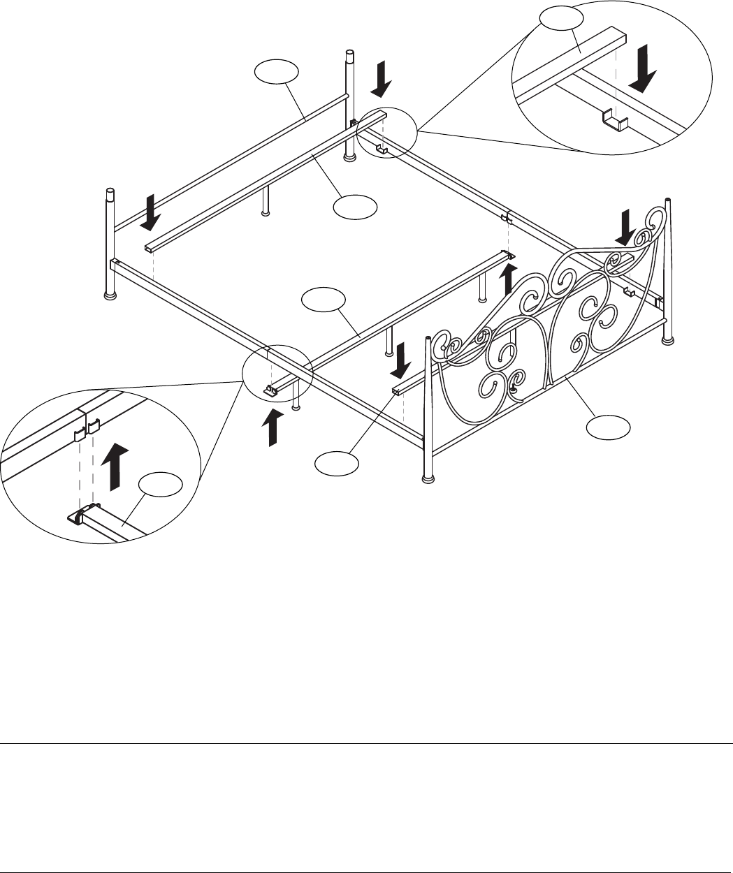 5. Desde arribe de los rieles del somier, COLOQUE las barras de las patas de soporte del somier (MBQ4) hacia abajo en los