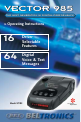 CONGRATULATIONS! Thank you for purchasing VECTOR 985. VECTOR 985 is in a class by itself, offering 16 Driver Selectable Features, 64 Digital Voice and Text Messages and the best possible X, K and Super Wideband Ka radar sensitivity. Enjoy your new detector and be sure to obey all laws where ever you may travel with VECTOR 985. Remember, owning a Radar detector does not give you a license to speed. Alerts from a Radar detector serve as an effective reminder to check your speed.