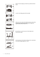 Different types of daisy chain Depending on your needs and input source, different cables should be connected properly. The second display (connected to the IN ports) DVI-OUT DVI-IN LAN switch RS-232C cable RJ45 cable HDMI-2 VGA OUT HDMI-1 VGA IN DVI HDMI cable cable AV cable D-Sub (15-pin) cable IR cable The first display (connected to the OUT ports) • Not all cables and daisy chains are available for all models. Check the specifications of the purchased model for the available connections.