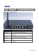 2-3 Mechanical Description Top panel of the WLAN Router The following table provides an overview of each LED activity: LED Power State On (Red) On (Green) Status WAN / LAN Link (Green) Indication When power on AWL700, this LED should always be red. When power on AWL700, AWL700 will do some initialization jobs, then this LED will be blinking steadily. When connect to the ADSL / Cable modem or connect to your PC, the LED should always be green. If this LED is not being lighted, this means link fails.