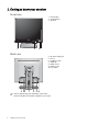 Viewing angle adjustment You may position the screen to the desired angle with -5° to +20° monitor tilt, 90° (left and right total) monitor swivel, and 130 mm monitor height. -5O ~ +20O -45 ~ +45 O O 130 mm How to detach the stand base 1. Prepare the monitor and area. Turn off the monitor and the power before unplugging the power cable. Turn off the computer before unplugging the monitor signal cable.