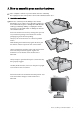 You might want to adjust the monitor stand height. See Adjusting the monitor stand height on page 11 for more information. You should position the monitor and angle the screen to minimize unwanted reflections from other light sources. -5O ~ +20O 2. Connect the PC video cable Do not use both DVI-D cable and D-Sub cable on the same PC. The only case in which both cables can be used is if they are connected to two different PCs with appropriate video systems. (Not available for analog-only models).
