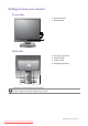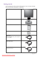 Getting started When unpacking please check you have the following items. If any are missing or damaged, please contact the place of purchase for a replacement. BenQ LCD Monitor Monitor Base Quick Start Guide CD-ROM Power Cord (Picture may differ from product supplied for your region.) Video Cable: D-Sub Video Cable: DVI-D (Optional accessory) Getting started Downloaded from ManualMonitor.