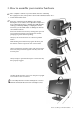 3. How to assemble your monitor hardware If the computer is turned on you must turn it off before continuing. Do not plug-in or turn-on the power to the monitor until instructed to do so. 1. Attach the monitor base. Please be careful to prevent damage to the monitor. Placing the screen surface on an object like a stapler or a mouse will crack the glass or damage the LCD substrate voiding your warranty.