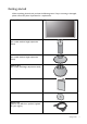 Getting started When unpacking please check you have the following items. If any are missing or damaged, please contact the place of purchase for a replacement. BenQ LCD Monitor Monitor Stand (for models without height adjustment stand) Monitor Base (for models without height adjustment stand) Monitor Base (for models with height adjustment stand) Quick Start Guide CD-ROM Power Cord (Picture may differ from product supplied for your region.