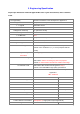 6.2 Control 6.2.1 IR Receivers 6.2.1.1 Location 2receiver, located on the front and rear of this projector 6.2.1.2 Range 8m ( front ) / 5m ( rear ) with 30 degree horizontal Angle and 15 degree vertical angle 7.0 Power Requirements 7.1 Power Supply VAC 100 – 240 Full range switch (50/60Hz), 3 Wire Grounded 7.2 Power Consumption 310W max. 7.3 Power Connector IEC 8.0 Audible Noise Level 34 dB ( Max) @ 25℃ sea level 9.0 Thermal 9.1 Surface Metal 60°C 9.2 Surface Plastic 65°C 9.