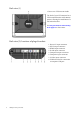 Back view (1) 1. Rear cover: VESA mount inside The back of your LCD monitor has a VESA standard mount with 100mm pattern, allowing the installation of a wall mount bracket. See Using the monitor wall mounting kit on page 12 to learn more. Back view(2): locations of plugs & sockets 1. Power AC input connector 2. DVI-D input connector 3. HDMI input connector 4. D-Sub input connector 5. Component input connector 6. Composite input connector 7. S-Video input connector 8.