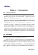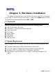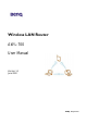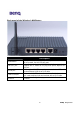 Chapter 1. Introduction 1.1 Product Introduction The AWL700 Wireless LAN Router can be used with wireless networking client devices such as the BenQ AWL100 Wireless LAN PC Card and BenQ AWL300 Wireless LAN USB Adapter for wireless access to an office LAN, or sharing of an xDSL/cable modem. The AWL700 also integrates a 4-port auto-sensing crossover Ethernet switch, expanding access to already established wired networks, and allowing IP sharing without the need for additional devices.